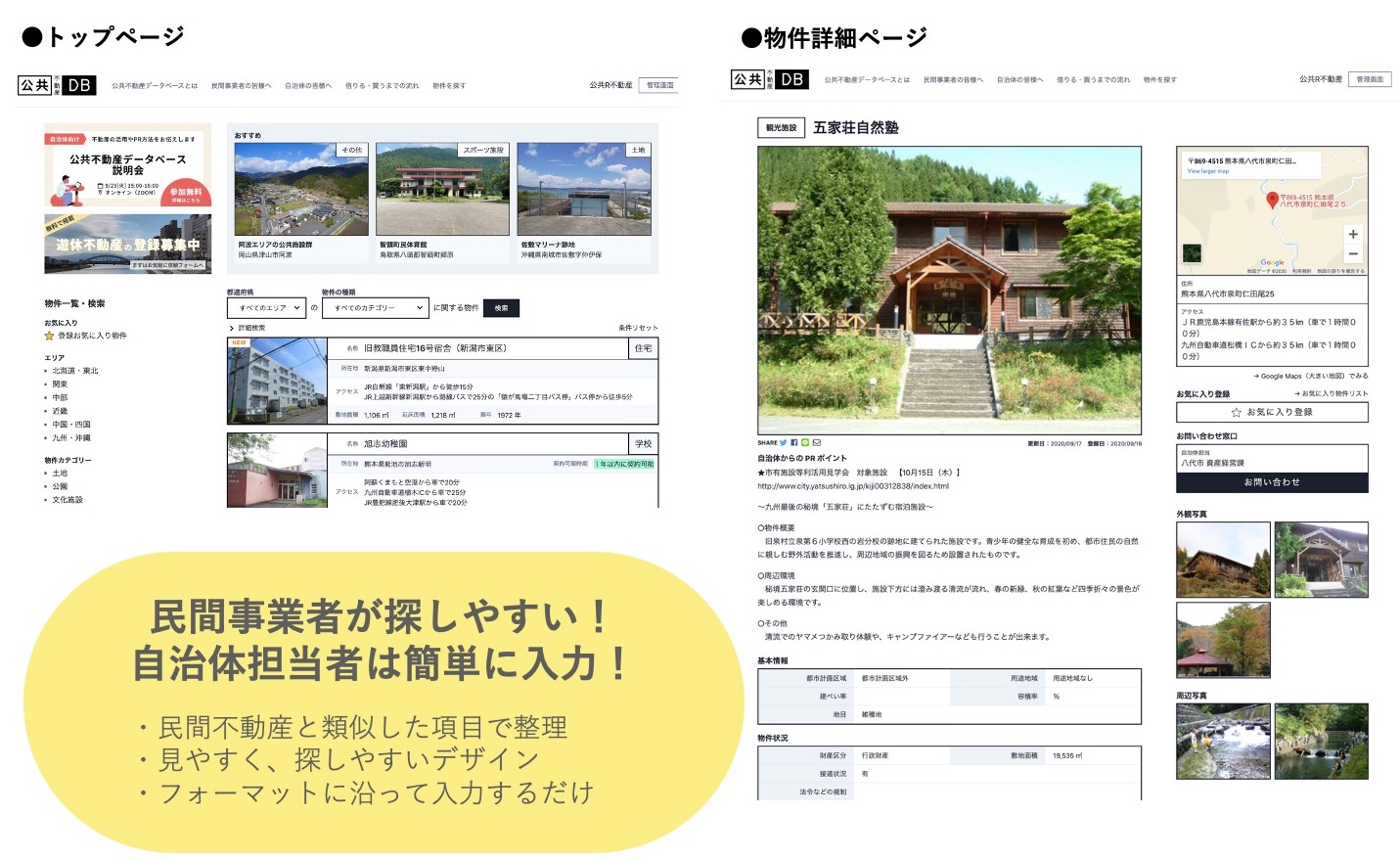 公共不動産情報にアプローチしたい民間にとって、自治体ごとに管理された公共不動産情報それぞれにアクセスして検索・閲覧するのは大変なことです。また活用に際して検討したい情報項目の記載がなかったり、写真等の判断材料が少なかったりなど、積極的な検討に進みにくい状況もありました。
