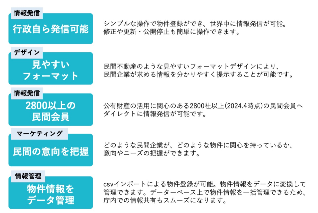 本サイトはこうした譲渡や賃貸という形だけでなく、自治体が行う民間事業者の公募やサウンディングなどの情報発信にも使われるなど、幅広いニーズで活用されています。