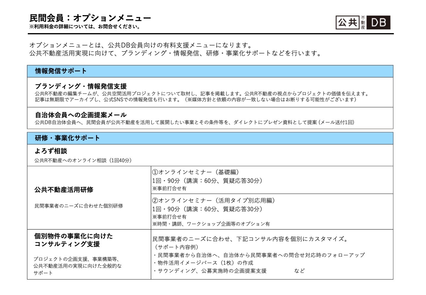 このほか、オプションサービスとしてオンラインセミナーやコンサル支援など、会員限定の有料サービスを用意しています(利用料金などの詳細はお問合せください)。